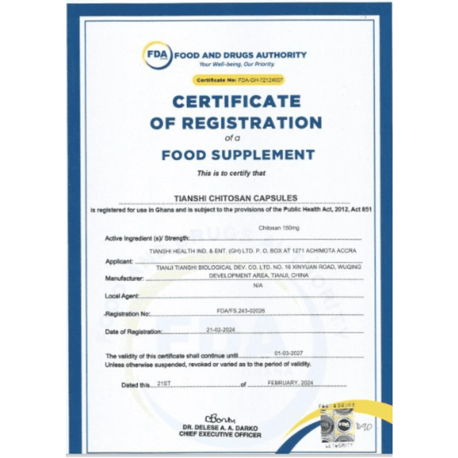 Chitosan is capable of revitalizing cell functions, relieve fatigue, speeds up the recuperating process and slows ageing. Chitosan can also inhibit the digestion and assimilation of lipids, absorb and eliminate cholesterol, thus preventing heart diseases.